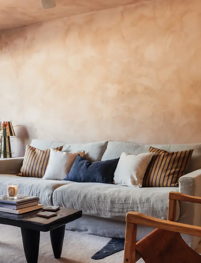 Limewash texture is a mineral-based coating primarily composed of slaked lime (calcium hydroxide), natural pigments, and carefully balanced additives. When applied to porous surfaces such as plaster, brick, concrete, or stone, the lime reacts with carbon dioxide in the atmosphere through a process known as carbonation. This reaction forms a durable mineral layer that integrates with the surface rather than sitting on top of it like conventional paint.